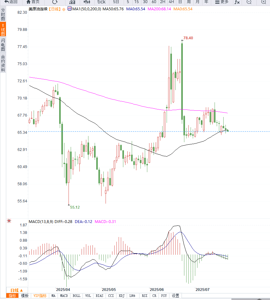 从日线图形来看,美原油(WTI)价格自6月下旬触及72美元高点后持续震荡下行,当前交投于65-68美元区间。布林带收口明显,显示市场动能减弱;